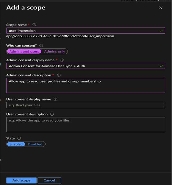 - Admin Consent Display = Admin Consent for Airmail2 User Sync + Auth